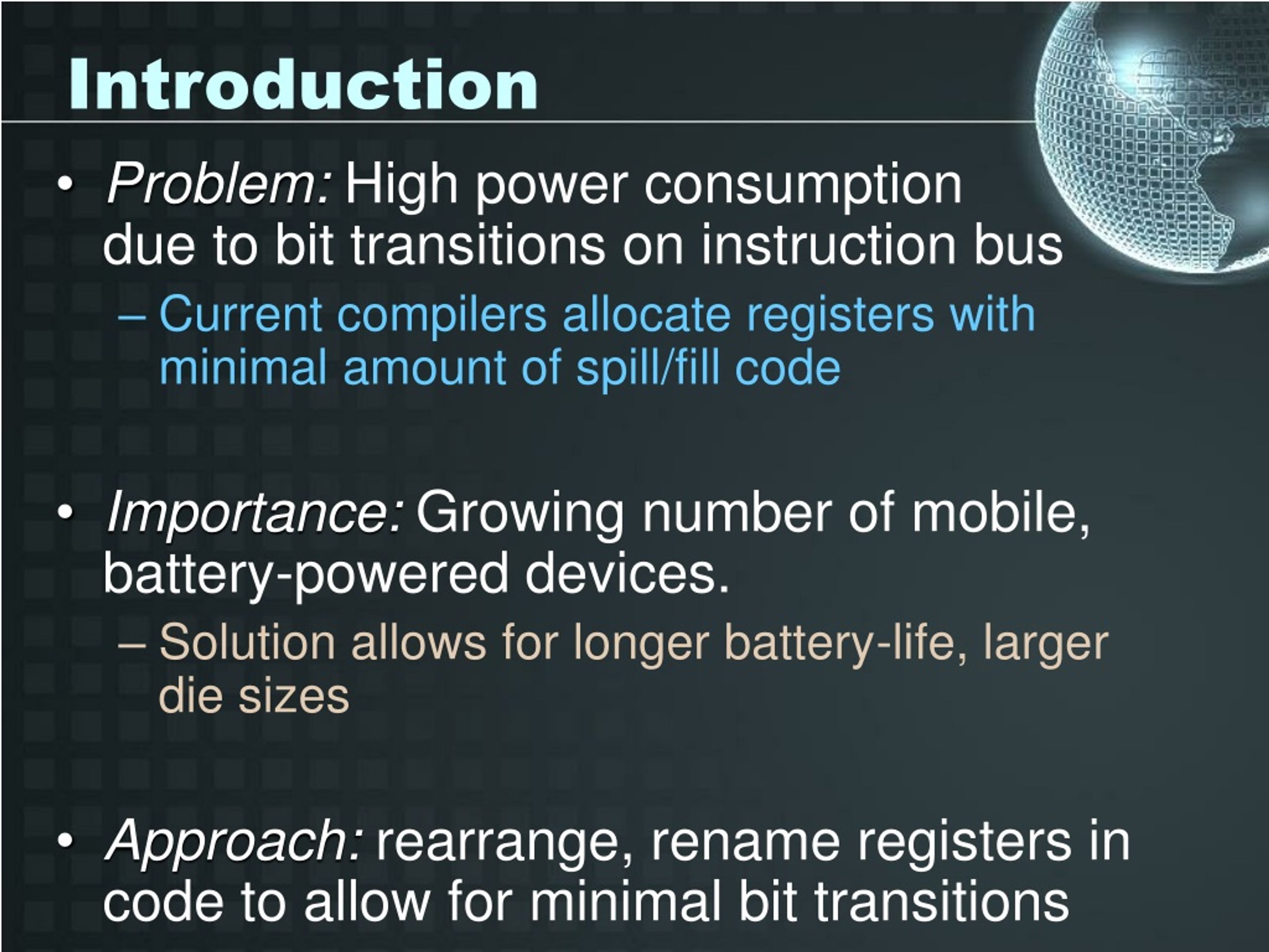 Introduction • Problem: High power consumption due to bit transitions on instruction bus • Current compilers allocate registers with minimal amount of spill/fill code • Importance: Growing number of mobile, battery-powered devices. • Solution allows for longer battery-life, larger die sizes • Approach: rearrange, rename registers in code to allow for minimal bit transitions