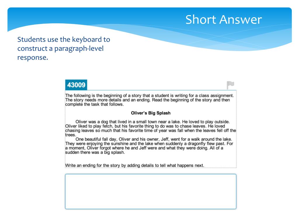 Short Answer Students use the keyboard to construct a paragraph-level response.