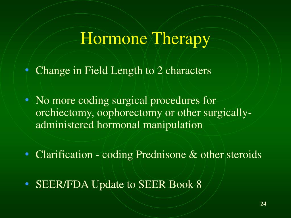 Hormone Therapy • Change in Field Length to 2 characters • No more coding surgical procedures for orchiectomy, oophorectomy or other surgically-administered hormonal manipulation • Clarification - coding Prednisone & other steroids • SEER/FDA Update to SEER Book 8