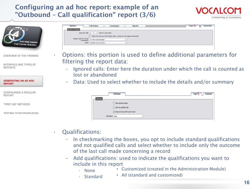 Configuring an ad hoc report: example of an "Outbound – Call qualification" report (1/6) • This report is used to obtain an overview of the number of calls, length of calls, coding and handling of calls • based on their qualification • for selected campaigns and agents • over a defined time interval • with details per campaign • The parameters set under the Options, Qualifications, Campaigns and Agents tabs, as well as the choice of report type and the actions to generate the report will be similar to other types of reports. • To begin, select the “Outbound - Call qualification” menu OVERVIEW OF THE TRAINING INTERFACE AND TYPES OF REPORTS GENERATING AN AD HOC REPORT CONFIGURING A REGULAR REPORT "FIRST AID" METHODS TESTING YOUR KNOWLEDGE