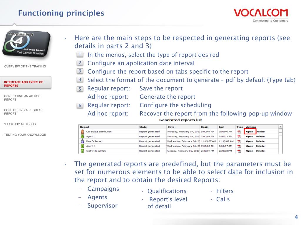 Functioning principles • Here are the main steps to be respected in generating reports (see details in parts 2 and 3) • In the menus, select the type of report desired • Configure an application date interval • Configure the report based on tabs specific to the report • Select the format of the document to generate – pdf by default (Type tab) Regular report: Save the report Ad hoc report: Generate the report Regular report: Configure the scheduling Ad hoc report: Recover the report from the following pop-up window • The generated reports are predefined, but the parameters must be set for numerous elements to be able to select data for inclusion in the report and to obtain the desired Reports: • Campaigns • Agents • Supervisor 1 2 OVERVIEW OF THE TRAINING INTERFACE AND TYPES OF REPORTS GENERATING AN AD HOC REPORT CONFIGURING A REGULAR REPORT "FIRST AID" METHODS TESTING YOUR KNOWLEDGE 3 4 5 6 • Qualifications • Report's level of detail • Filters • Calls