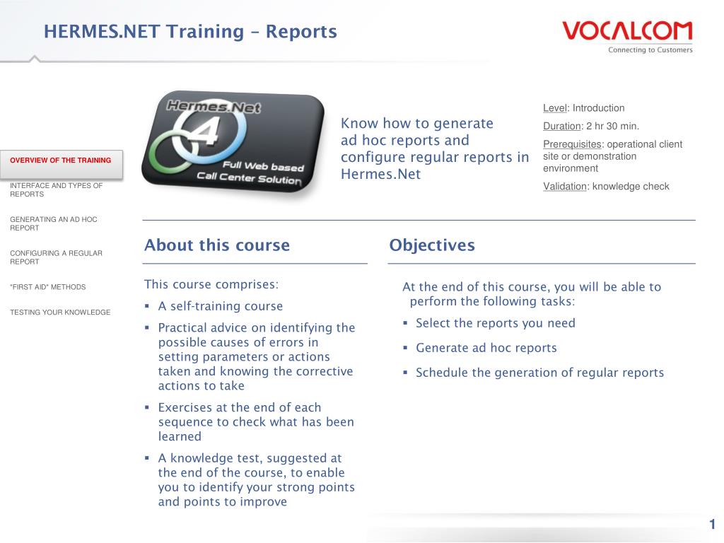HERMES.NET TRAINING. Reports. HERMES.NET Training – Reports. Level : Introduction Duration : 2 hr 30 min. Prerequisites : operational client site or demonstration environment Validation : knowledge check. Know how to generate ad hoc reports and configure regular reports in Hermes.Net.