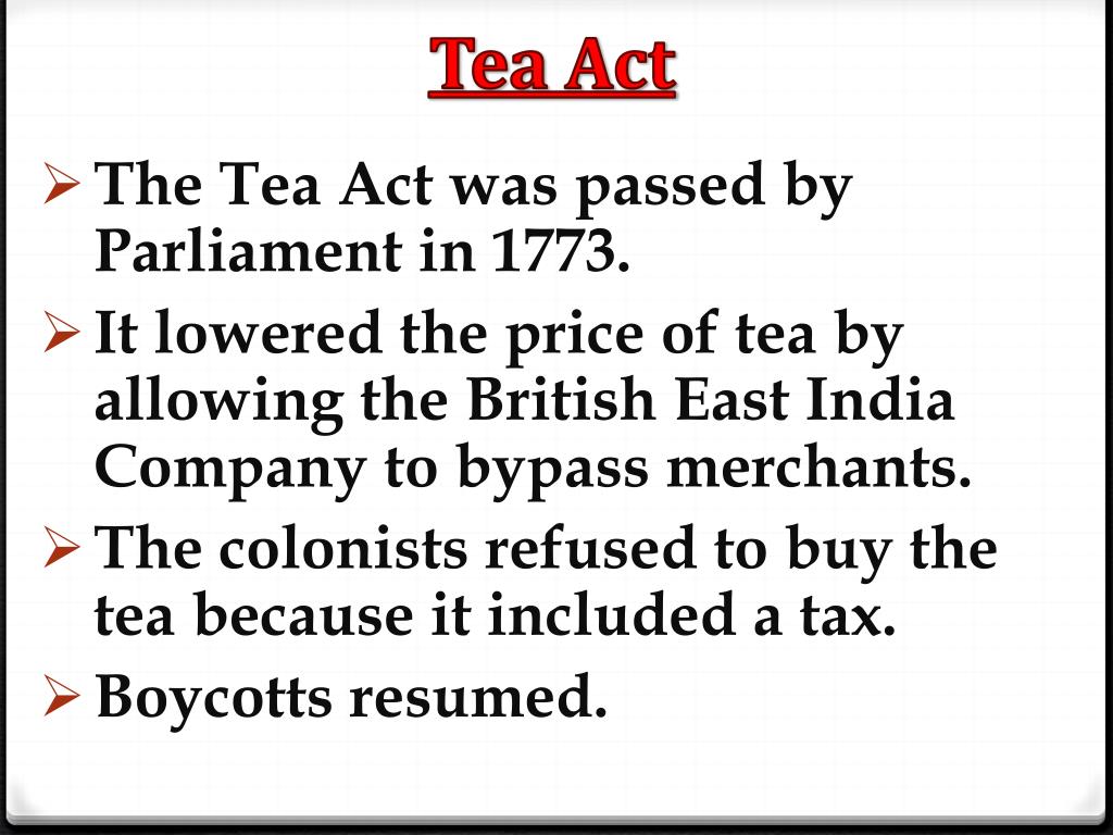 Tea Act • The Tea Act was passed by Parliament in 1773. • It lowered the price of tea by allowing the British East India Company to bypass merchants. • The colonists refused to buy the tea because it included a tax. • Boycotts resumed.