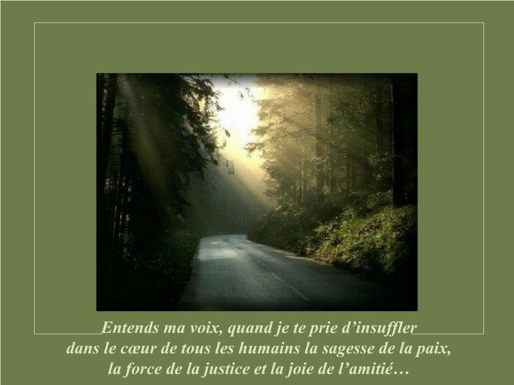 Entends ma voix, quand je te prie d’insuffler dans le cœur de tous les humains la sagesse de la paix, la force de la justice et la joie de l’amitié…