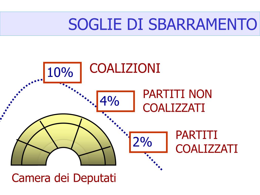 SOGLIE DI SBARRAMENTO COALIZIONI 10% PARTITI NON COALIZZATI 4% PARTITI COALIZZATI 2% Camera dei Deputati
