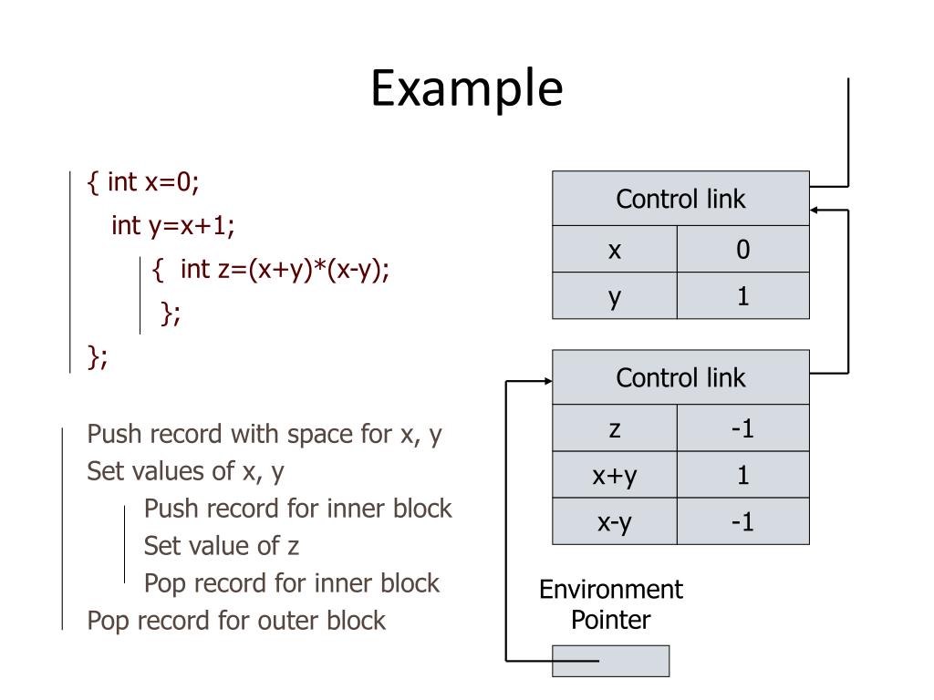 Control link x 0 y 1 Control link • Push record with space for x, y • Set values of x, y • Push record for inner block • Set value of z • Pop record for inner block • Pop record for outer block • { int x=0; • int y=x+1; • { int z=(x+y)*(x-y); • }; • }; z -1 x+y 1 x-y -1 Environment Pointer Example