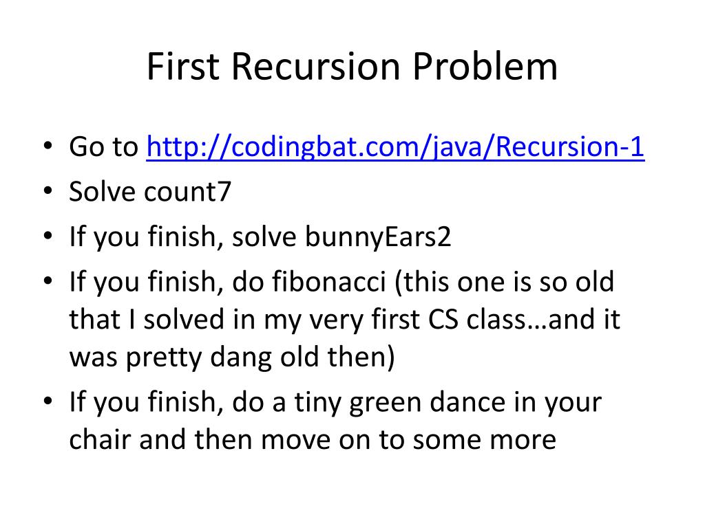 First Recursion Problem • Go to http://codingbat.com/java/Recursion-1 • Solve count7 • If you finish, solve bunnyEars2 • If you finish, do fibonacci (this one is so old that I solved in my very first CS class…and it was pretty dang old then) • If you finish, do a tiny green dance in your chair and then move on to some more