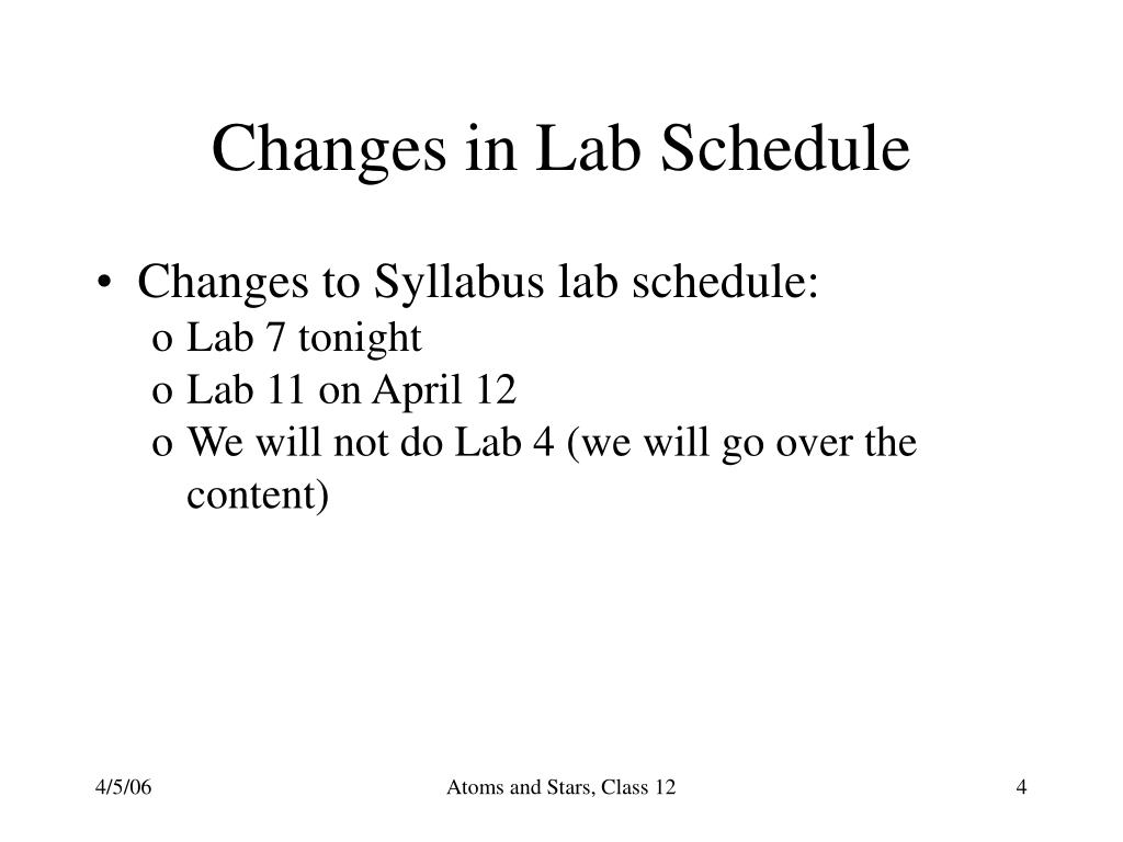 Changes in Lab Schedule • Changes to Syllabus lab schedule: • Lab 7 tonight • Lab 11 on April 12 • We will not do Lab 4 (we will go over the content) Atoms and Stars, Class 12
