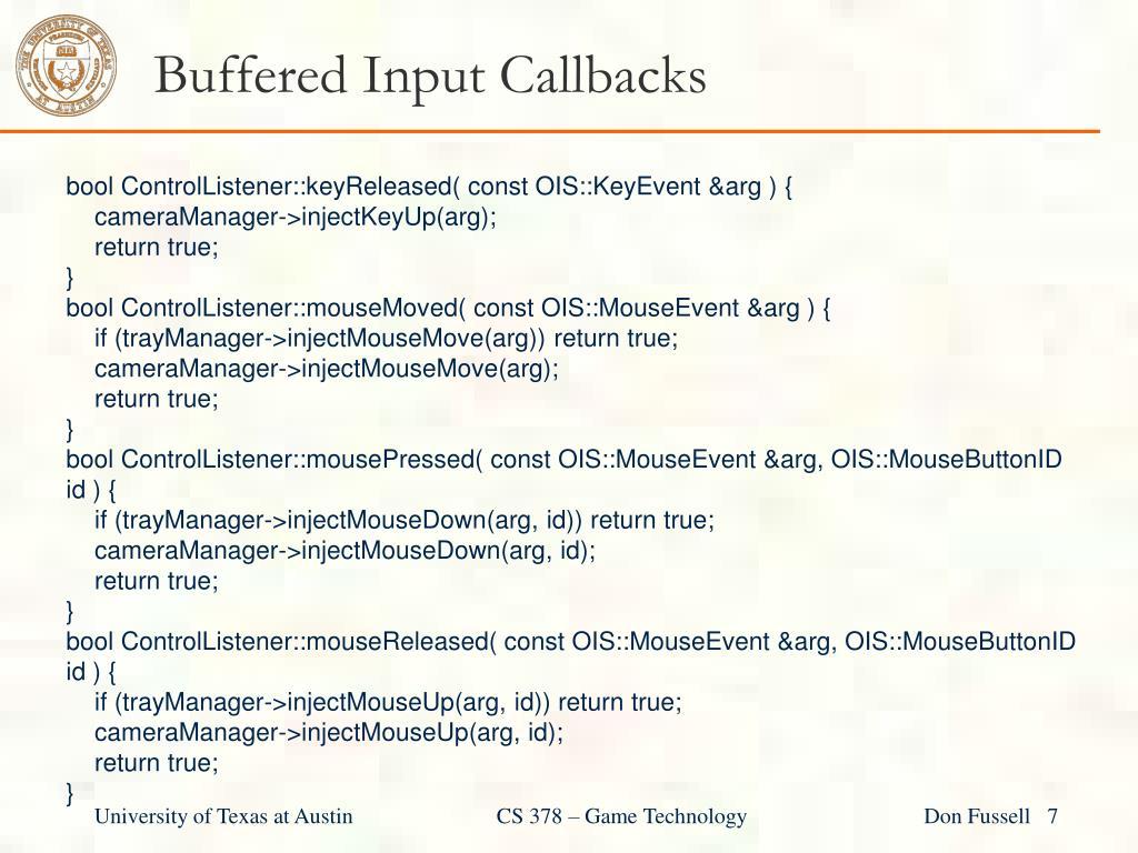 Buffered Input Callbacks boolControlListener::keyReleased( const OIS::KeyEvent &arg) { cameraManager->injectKeyUp(arg); return true; } boolControlListener::mouseMoved( const OIS::MouseEvent &arg) { if (trayManager->injectMouseMove(arg)) return true; cameraManager->injectMouseMove(arg); return true; } boolControlListener::mousePressed( const OIS::MouseEvent &arg, OIS::MouseButtonID id ) { if (trayManager->injectMouseDown(arg, id)) return true; cameraManager->injectMouseDown(arg, id); return true; } boolControlListener::mouseReleased( const OIS::MouseEvent &arg, OIS::MouseButtonID id ) { if (trayManager->injectMouseUp(arg, id)) return true; cameraManager->injectMouseUp(arg, id); return true; } University of Texas at Austin CS 378 – Game Technology Don Fussell 7