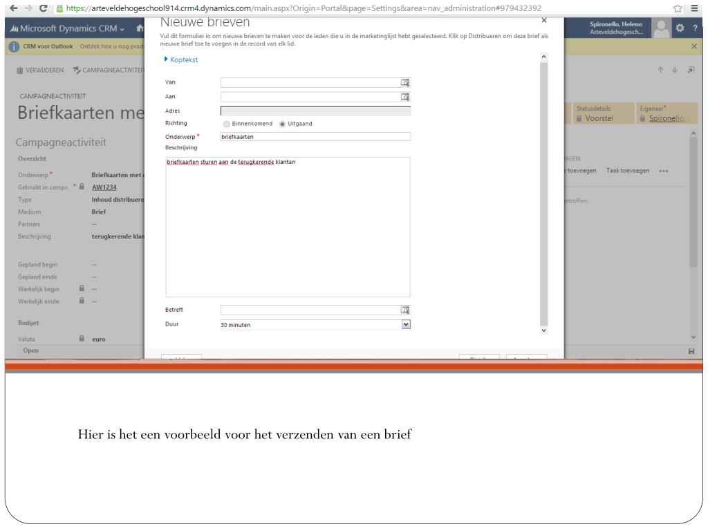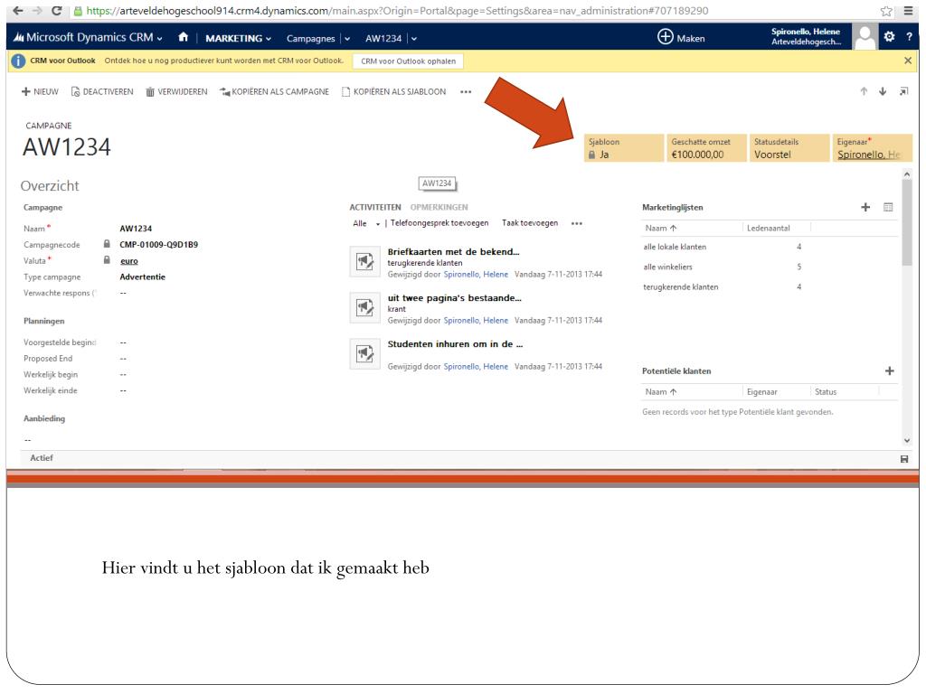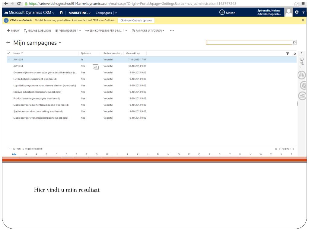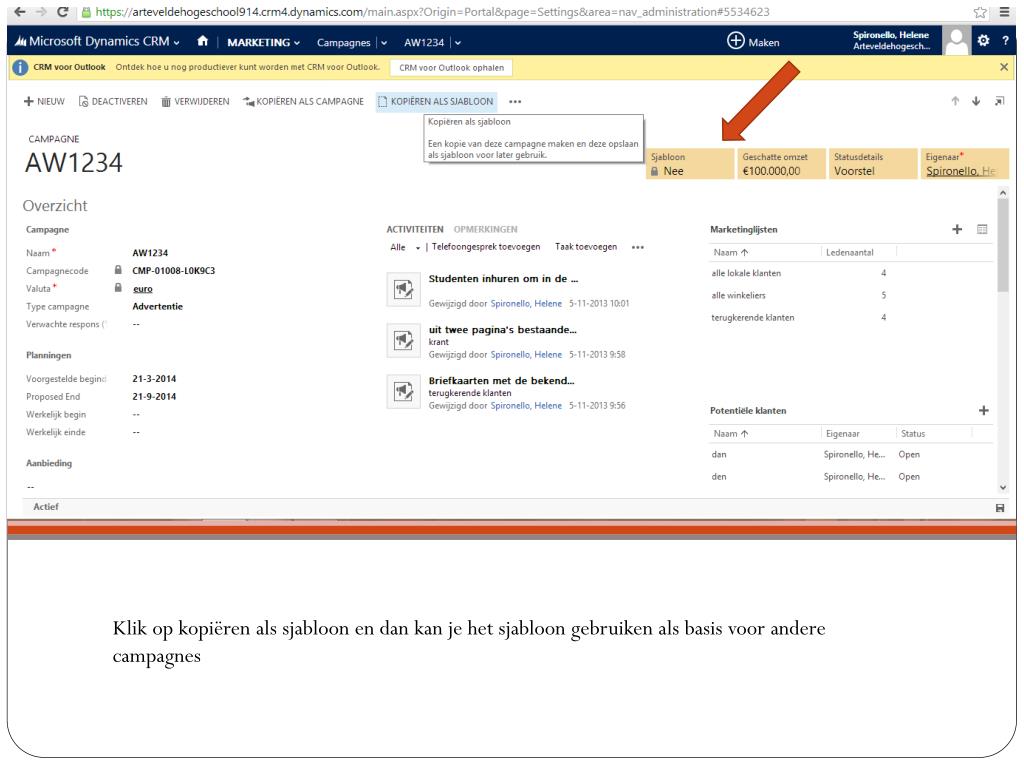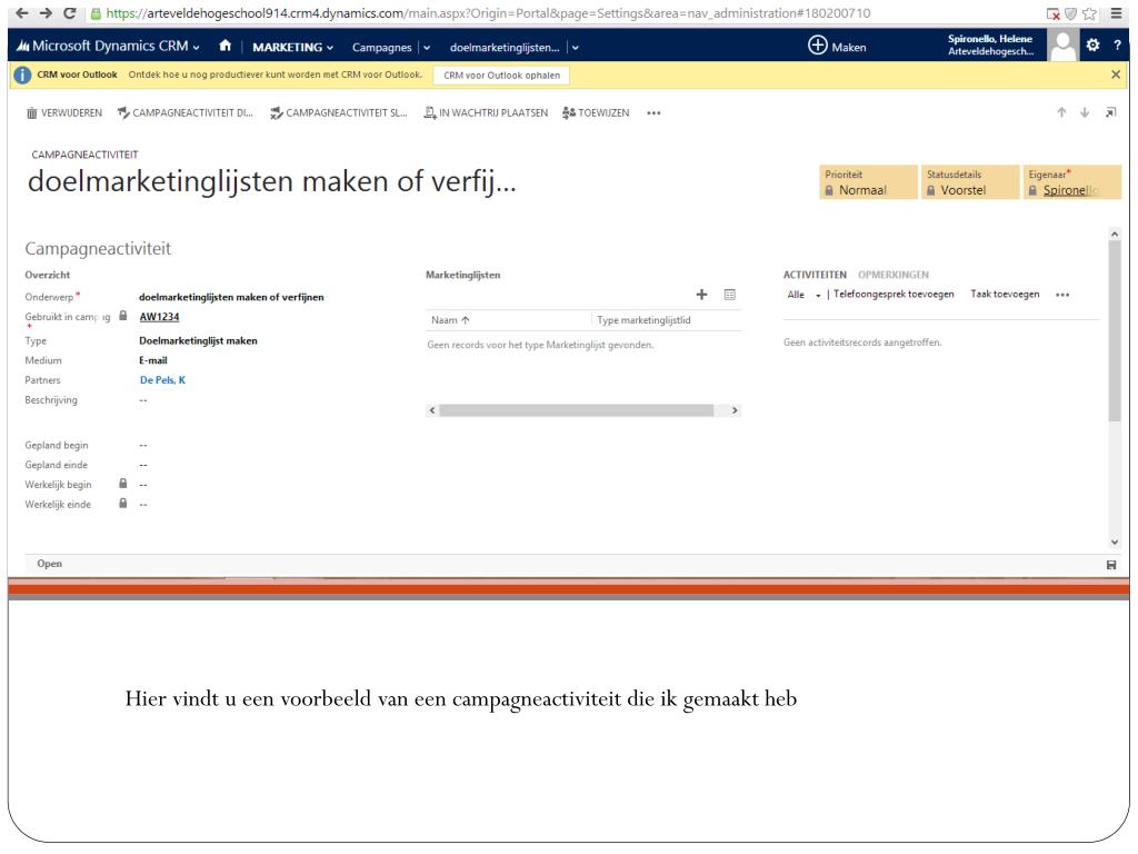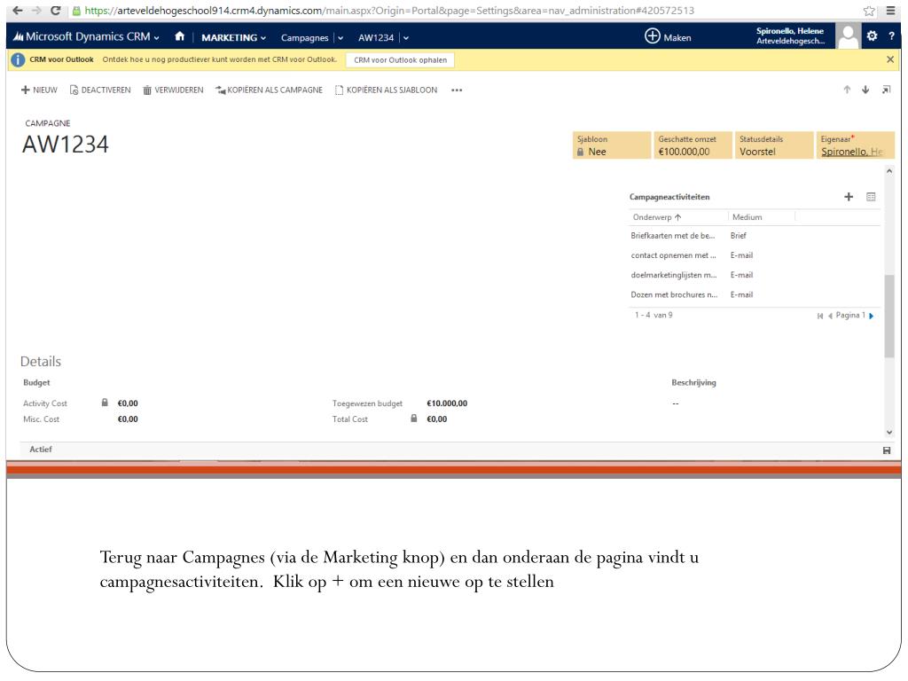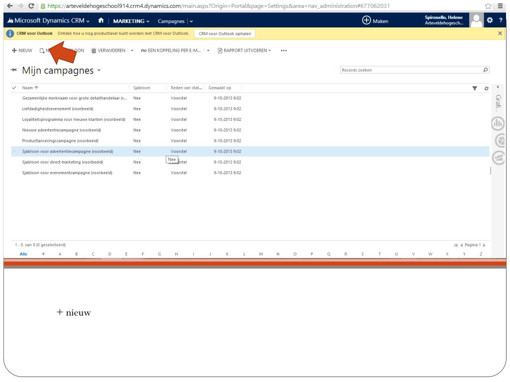Een geslaagde campagne plannen. Opdracht 3 Spironello Hélène. Campagne. Zodra u op Microsoft Dynamics bent , klik op CRM, dan op marketing. Klik vervolgens op campagnes. + nieuw. De velden invullen met uw gegevens. Budget en beheer invullen. Campagnesjabloon.
