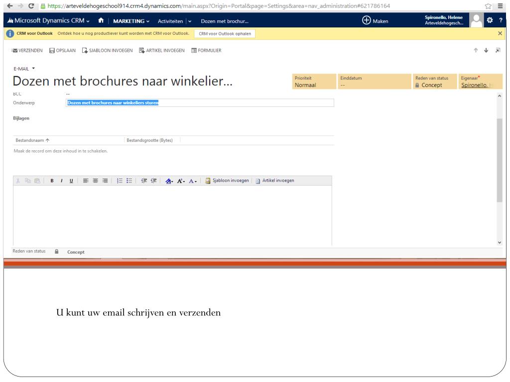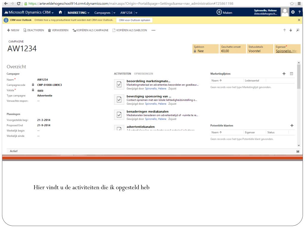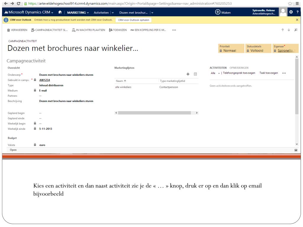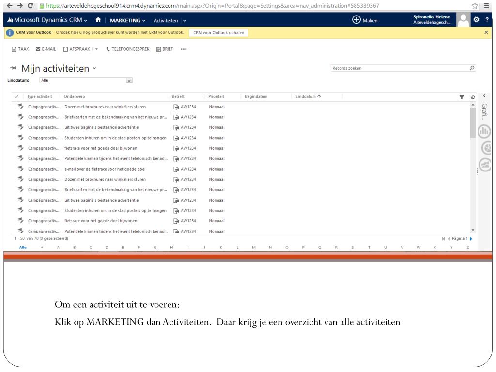 Om eenactiviteituit te voeren: Klik op MARKETING dan Activiteiten. Daarkrijg je eenoverzicht van alleactiviteiten