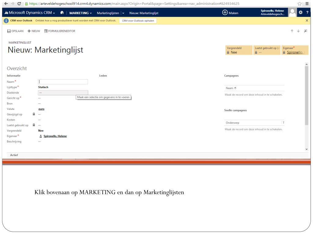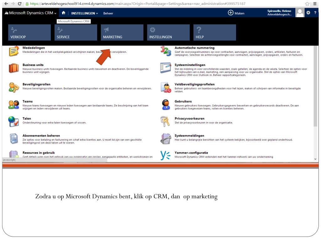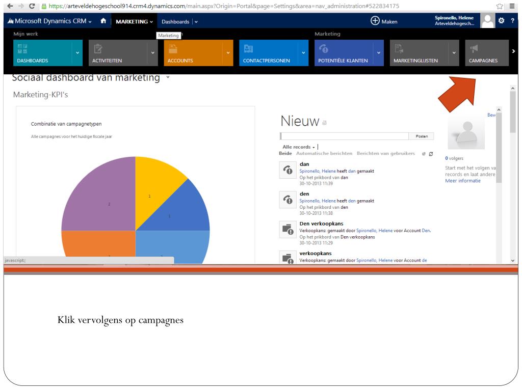 Zodra u op Microsoft Dynamics bent, klik op CRM, dan op marketing