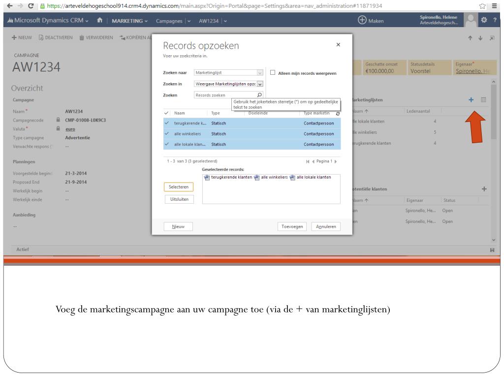 Voeg de marketingscampagneaanuw campagne toe (via de + van marketinglijsten)