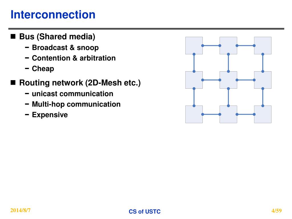 Interconnection • Bus (Shared media) • Broadcast & snoop • Contention & arbitration • Cheap • Routing network (2D-Mesh etc.) • unicast communication • Multi-hop communication • Expensive CS of USTC