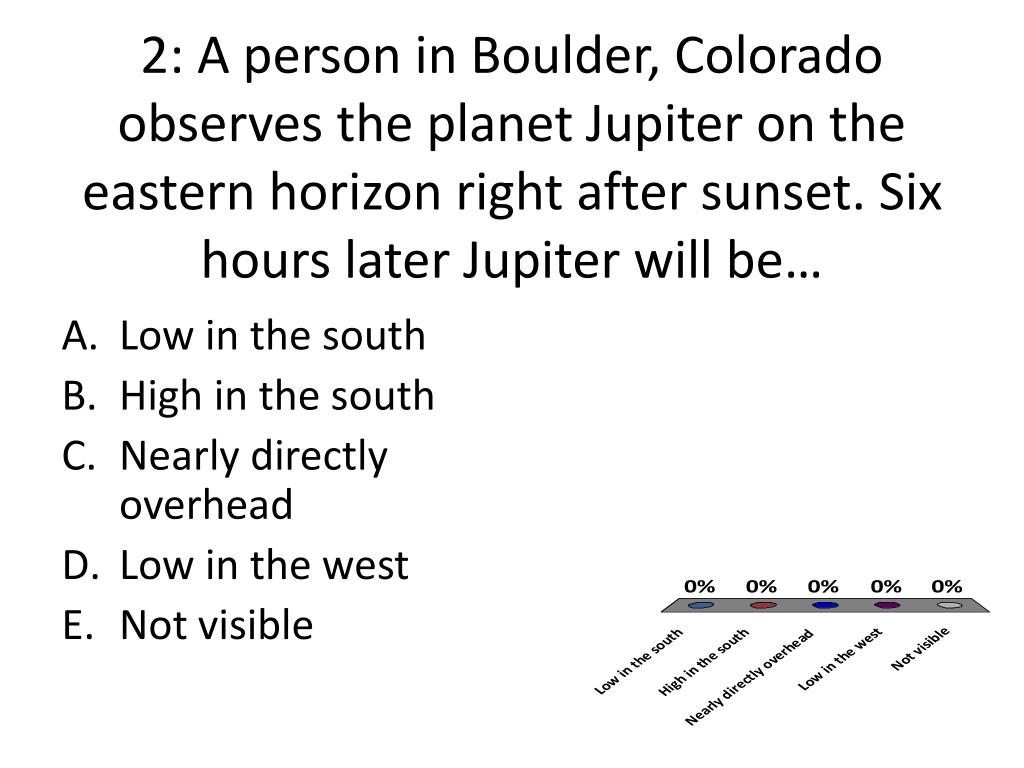 2: A person in Boulder, Colorado observes the planet Jupiter on the eastern horizon right after sunset. Six hours later Jupiter will be… • Low in the south • High in the south • Nearly directly overhead • Low in the west • Not visible