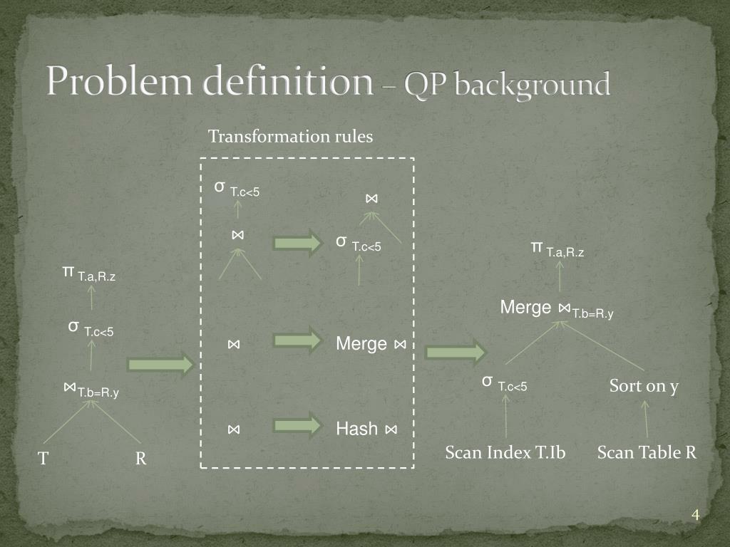 Problem definition – QP background Transformation rules πT.a,R.z πT.a,R.z σT.c<5 σT.c<5 Merge ⋈T.b=R.y ⋈ ⋈ Merge ⋈ ⋈ ⋈T.b=R.y σT.c<5 σT.c<5 Sort on y ⋈ Hash ⋈ T R Scan Index T.Ib Scan Table R