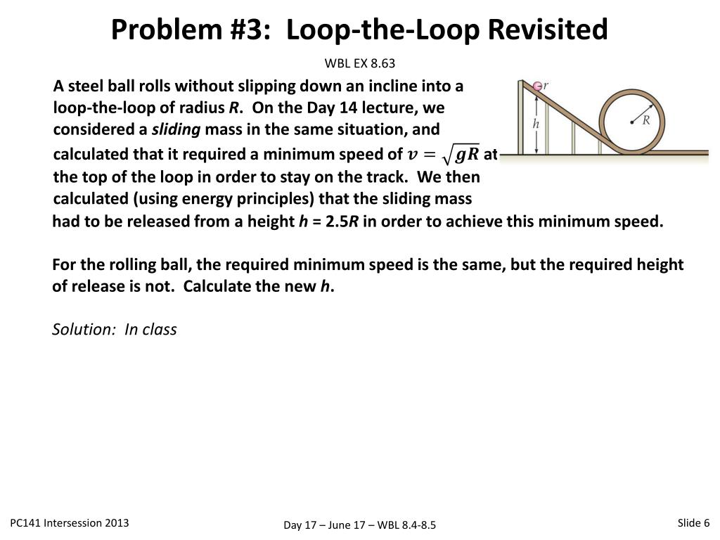 Problem #3: Loop-the-Loop Revisited WBL EX 8.63 A steel ball rolls without slipping down an incline into a loop-the-loop of radius R. On the Day 14 lecture, we considered a slidingmass in the same situation, and calculated that it required a minimum speed of at the top of the loop in order to stay on the track. We then calculated (using energy principles) that the sliding mass had to be released from a height h = 2.5R in order to achieve this minimum speed. For the rolling ball, the required minimum speed is the same, but the required height of release is not. Calculate the new h. • Solution: In class