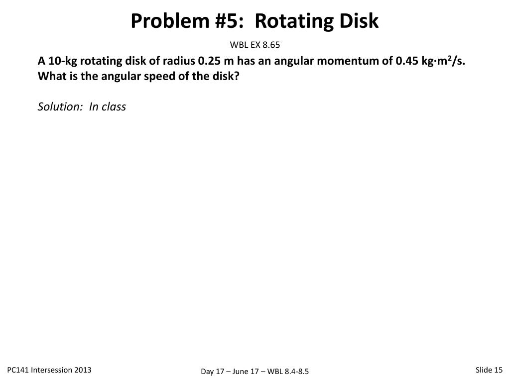 Problem #5: Rotating Disk WBL EX 8.65 A 10-kg rotating disk of radius 0.25 m has an angular momentum of 0.45 kg·m2/s. What is the angular speed of the disk? • Solution: In class