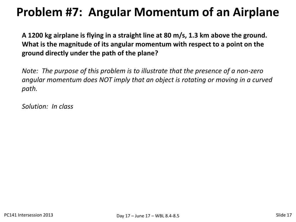 Problem #7: Angular Momentum of an Airplane A 1200 kg airplane is flying in a straight line at 80 m/s, 1.3 km above the ground. What is the magnitude of its angular momentum with respect to a point on the ground directly under the path of the plane? Note: The purpose of this problem is to illustrate that the presence of a non-zero angular momentum does NOT imply that an object is rotating or moving in a curved path. • Solution: In class