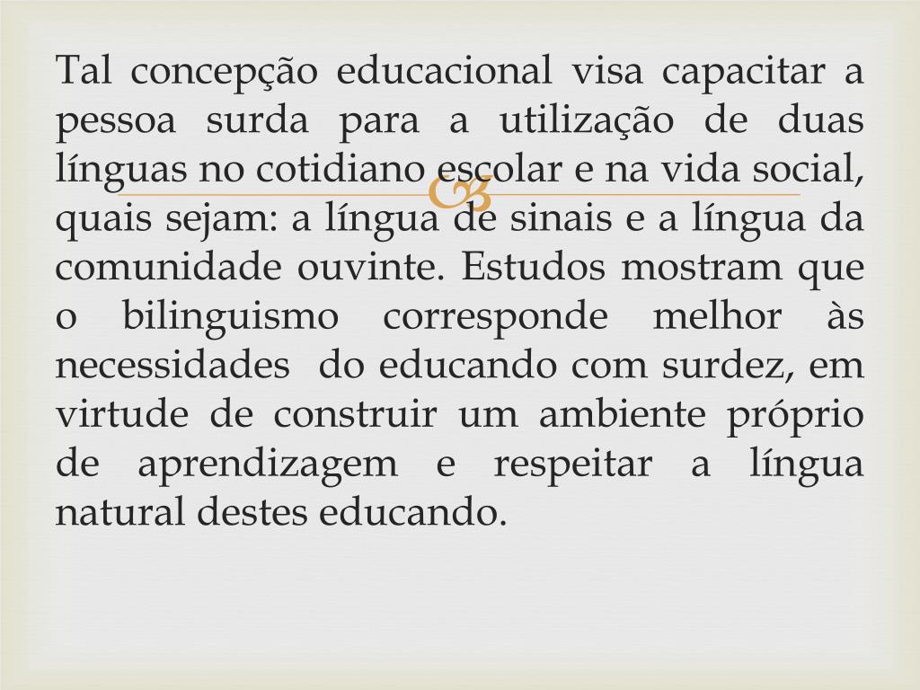 Tal concepção educacional visa capacitar a pessoa surda para a utilização de duas línguas no cotidiano escolar e na vida social, quais sejam: a língua de sinais e a língua da comunidade ouvinte. Estudos mostram que o bilinguismo corresponde melhor às necessidades do educando com surdez, em virtude de construir um ambiente próprio de aprendizagem e respeitar a língua natural destes educando.