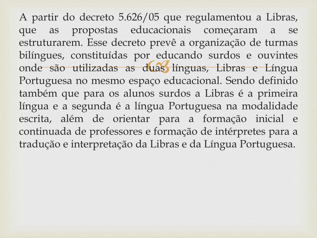 A partir do decreto 5.626/05 que regulamentou a Libras, que as propostas educacionais começaram a se estruturarem. Esse decreto prevê a organização de turmas bilíngues, constituídas por educando surdos e ouvintes onde são utilizadas as duas línguas, Libras e Língua Portuguesa no mesmo espaço educacional. Sendo definido também que para os alunos surdos a Libras é a primeira língua e a segunda é a língua Portuguesa na modalidade escrita, além de orientar para a formação inicial e continuada de professores e formação de intérpretes para a tradução e interpretação da Libras e da Língua Portuguesa.