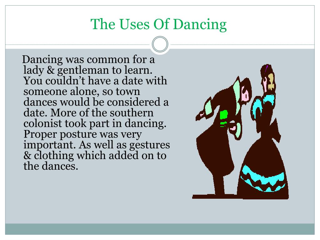 The Uses Of Dancing Dancing was common for a lady & gentleman to learn. You couldn’t have a date with someone alone, so town dances would be considered a date. More of the southern colonist took part in dancing. Proper posture was very important. As well as gestures & clothing which added on to the dances.