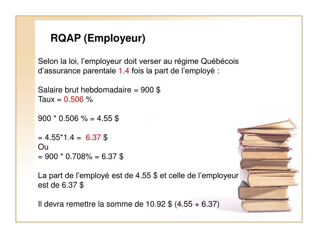 RQAP (Employeur) Selon la loi, l’employeur doit verser au régime Québécois d’assurance parentale 1.4 fois la part de l’employé :Salaire brut hebdomadaire = 900 $ Taux = 0.506 %900 * 0.506 % = 4.55 $ = 4.55*1.4 = 6.37 $ Ou = 900 * 0.708% = 6.37 $ La part de l’employé est de 4.55 $ et celle de l’employeur est de 6.37 $Il devra remettre la somme de 10.92 $ (4.55 + 6.37)
