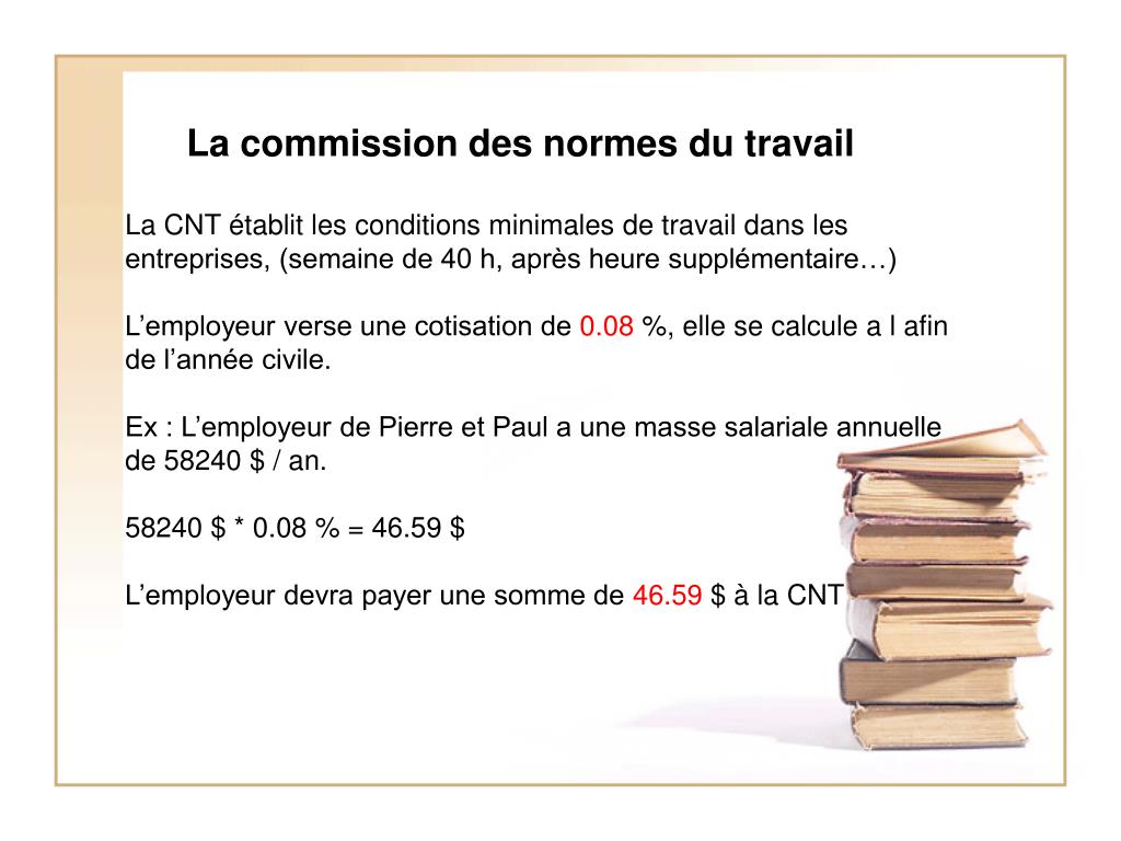 La commission des normes du travail La CNT établit les conditions minimales de travail dans les entreprises, (semaine de 40 h, après heure supplémentaire…)L’employeur verse une cotisation de 0.08 %, elle se calcule a l afin de l’année civile.Ex : L’employeur de Pierre et Paul a une masse salariale annuelle de 58240 $ / an.58240 $ * 0.08 % = 46.59 $L’employeur devra payer une somme de 46.59 $ à la CNT