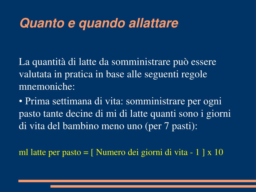 La quantità di latte da somministrare può essere valutata in pratica in base alle seguenti regole mnemoniche: • Prima settimana di vita: somministrare per ogni pasto tante decine di mi di latte quanti sono i giorni di vita del bambino meno uno (per 7 pasti): ml latte per pasto = [ Numero dei giorni di vita - 1 ] x 10 Quanto e quando allattare