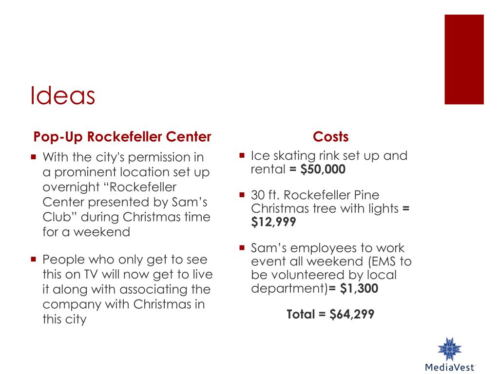 Ideas Pop-Up Rockefeller Center Costs Ice skating rink set up and rental = $50,000 30 ft. Rockefeller Pine Christmas tree with lights = $12,999 Sam’s employees to work event all weekend (EMS to be volunteered by local department)= $1,300 Total = $64,299 • With the city's permission in a prominent location set up overnight “Rockefeller Center presented by Sam’s Club” during Christmas time for a weekend • People who only get to see this on TV will now get to live it along with associating the company with Christmas in this city