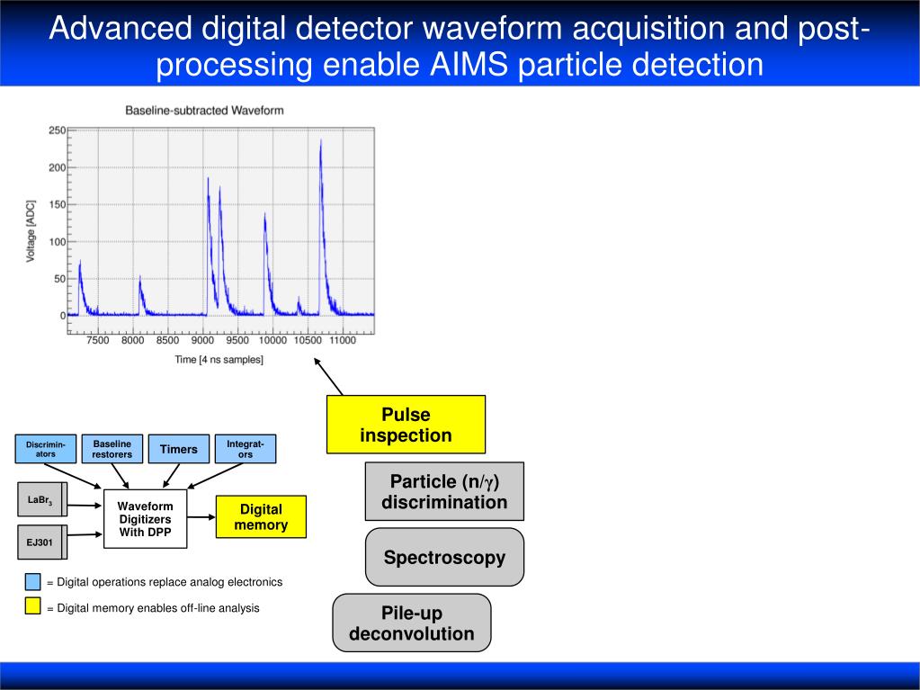 Advanced digital waveform acquisition and post-processing enable AIMS particle detection Gammas Neutrons Pulse inspection Discrimin- ators Baseline restorers Timers Integrat- ors Particle (n/γ) discrimination LaBr3 Waveform Digitizers With DPP Digital memory EJ301 Spectroscopy = Digital operations replace analog electronics Pile-up deconvolution = Digital memory enables off-line analysis