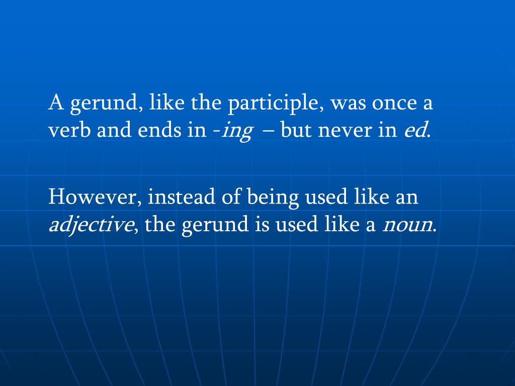 A gerund, like the participle, was once a verb and ends in -ing – but never in ed. However, instead of being used like an adjective, the gerund is used like a noun.