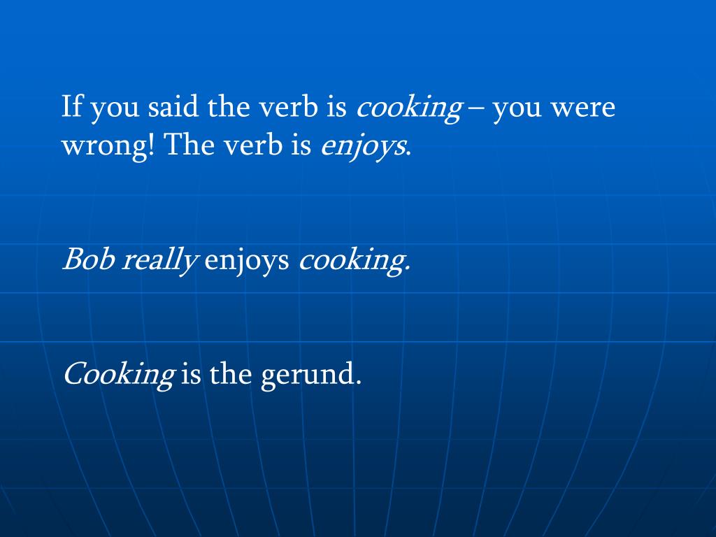 If you said the verb is cooking – you were wrong! The verb is enjoys. Bob really enjoys cooking. Cooking is the gerund.