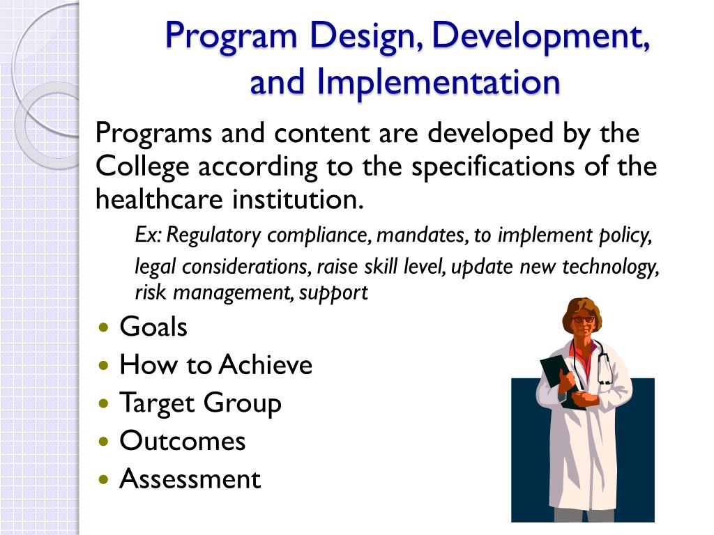 Program Design, Development, and Implementation Programs and content are developed by the College according to the specifications of the healthcare institution. Ex: Regulatory compliance, mandates, to implement policy, legal considerations, raise skill level, update new technology, risk management, support • Goals • How to Achieve • Target Group • Outcomes • Assessment