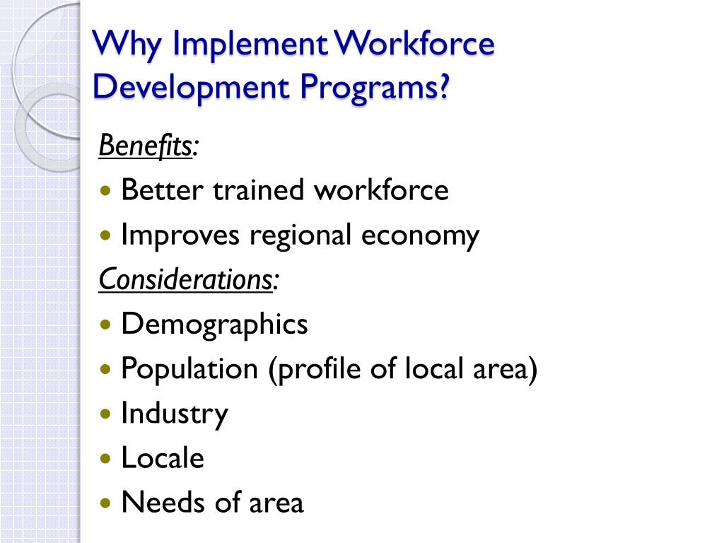 Why Implement Workforce Development Programs? Benefits: • Better trained workforce • Improves regional economy Considerations: • Demographics • Population (profile of local area) • Industry • Locale • Needs of area