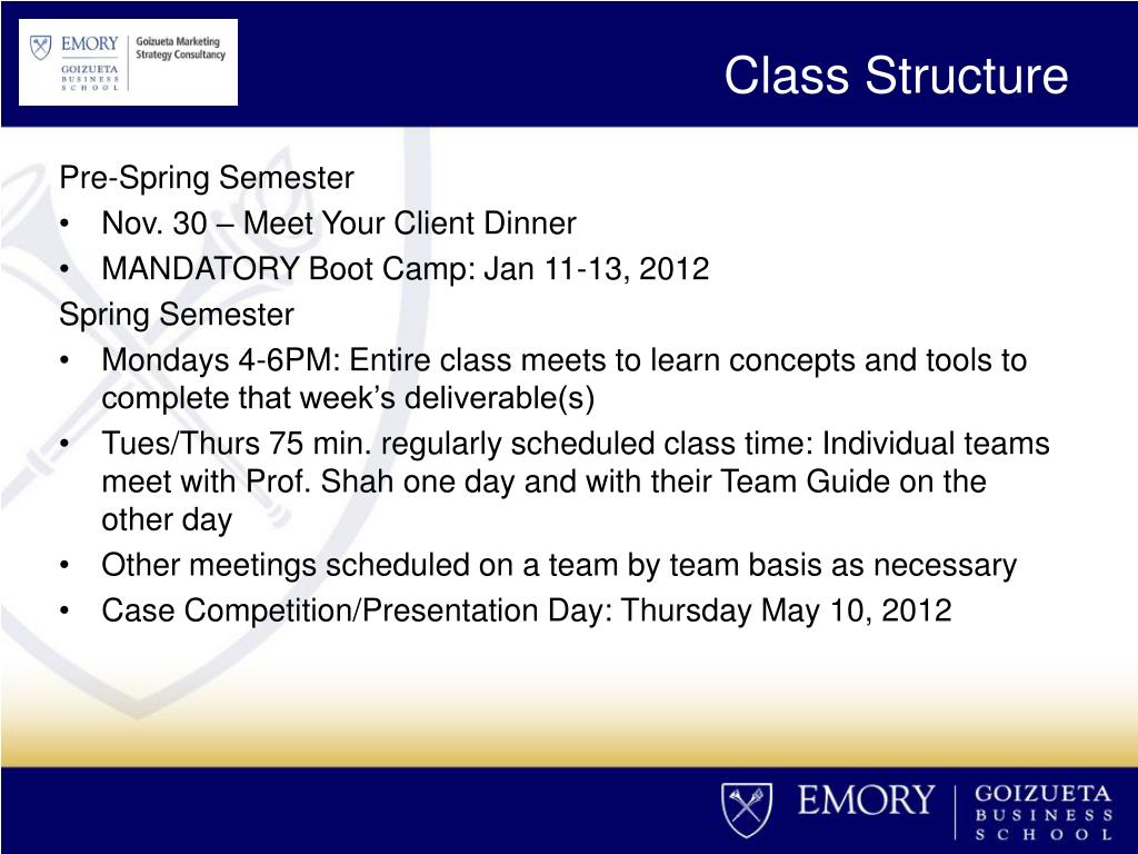Class Structure Pre-Spring Semester Nov. 30 – Meet Your Client Dinner MANDATORY Boot Camp: Jan 11-13, 2012 Spring Semester Mondays 4-6PM: Entire class meets to learn concepts and tools to complete that week’s deliverable(s) Tues/Thurs 75 min. regularly scheduled class time: Individual teams meet with Prof. Shah one day and with their Team Guide on the other day Other meetings scheduled on a team by team basis as necessary Case Competition/Presentation Day: Thursday May 10, 2012