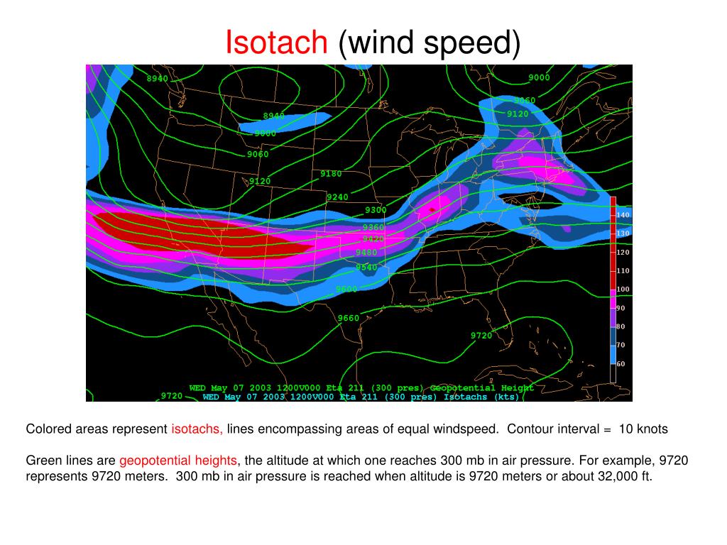 Isotach (wind speed) Colored areas represent isotachs, lines encompassing areas of equal windspeed. Contour interval = 10 knots Green lines are geopotential heights, the altitude at which one reaches 300 mb in air pressure. For example, 9720 represents 9720 meters. 300 mb in air pressure is reached when altitude is 9720 meters or about 32,000 ft.