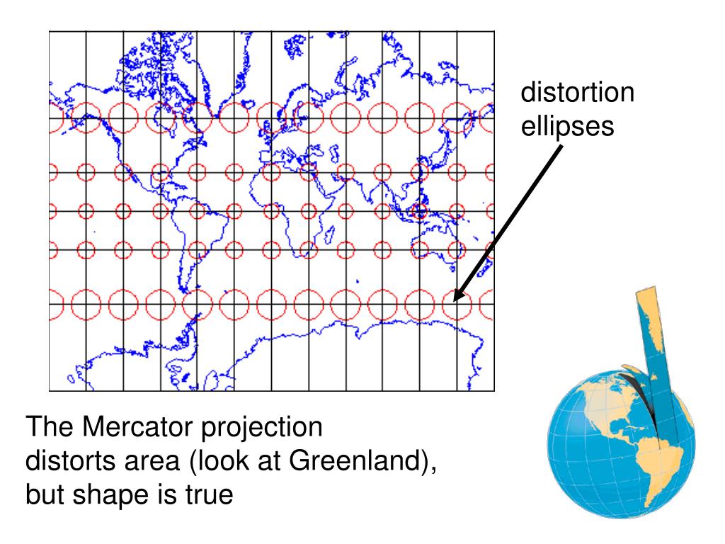 distortion ellipses The Mercator projection distorts area (look at Greenland), but shape is true