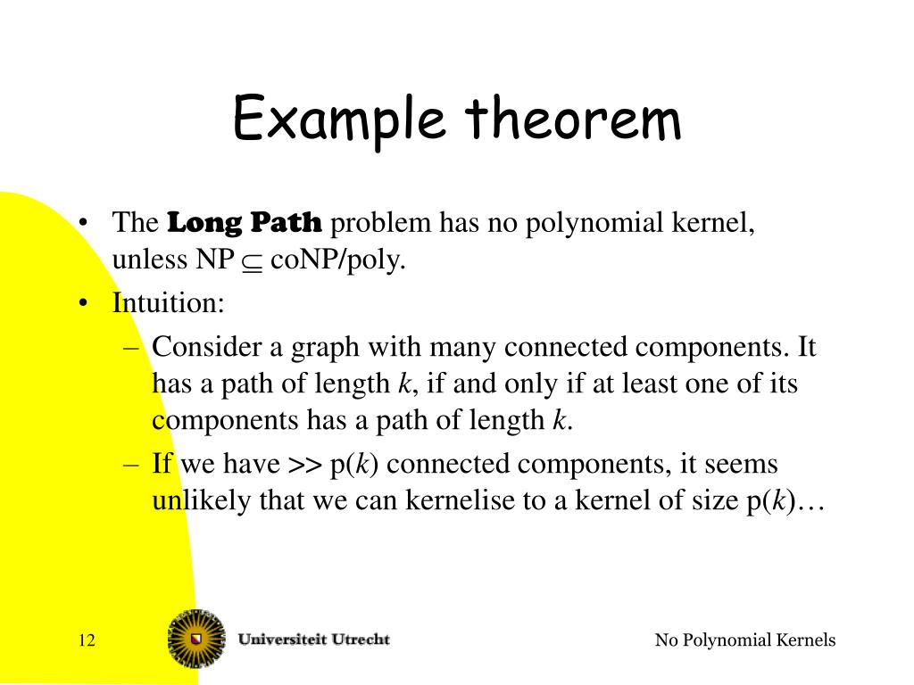 Example theorem • The Long Path problem has no polynomial kernel, unless NP Í coNP/poly. • Intuition: • Consider a graph with many connected components. It has a path of length k, if and only if at least one of its components has a path of length k. • If we have >> p(k)connected components, it seems unlikely that we can kernelise to a kernel of size p(k)… No Polynomial Kernels