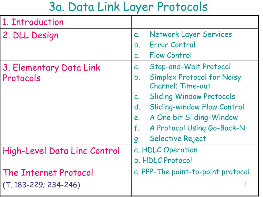 PPP-summary • PPP is a multiprotocol framing mechanism suitable for use over:Modems, HDLC,SONET, Other physical layers. • It supports:Error detection, Option negotiating, Header compression. • DLL converts the raw bit stream (from physical layer) into a stream of frames (for network layer). • Various framing methods are used:character count, byte stuffing, and bit stuffing. • Data link protocols can provide:1. Error control to retransmit damaged or lost frames. 2.To prevent a fast sender from overrunning a slow receiver. • The data link protocol also provide flow control. • The sliding window mechanism is used to integrate error control and flow control in a convenient way