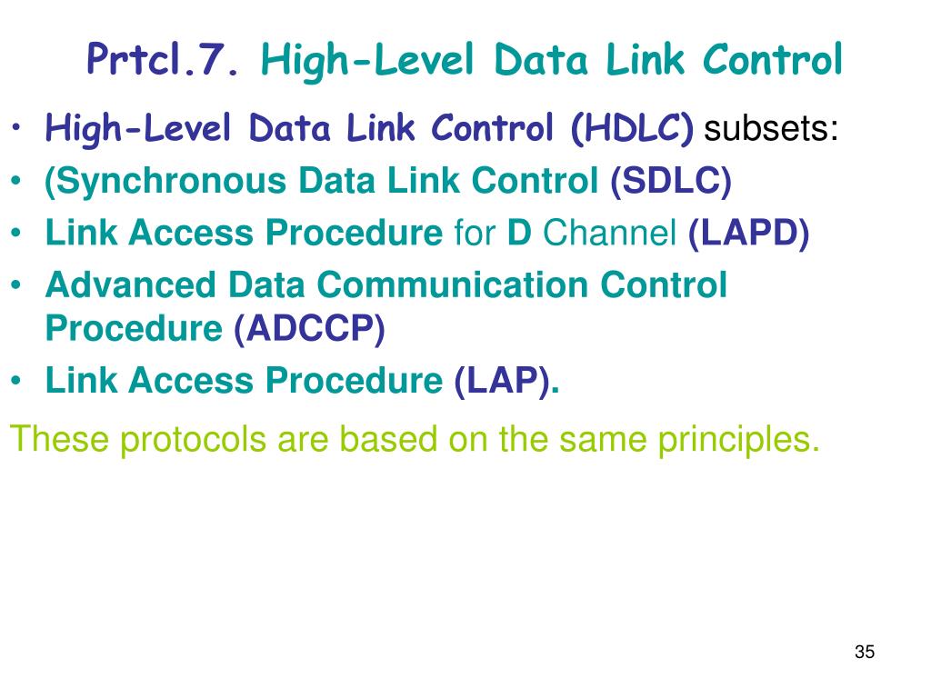 Prtcl.7. High-Level Data Link Control • High-Level Data Link Control (HDLC) subsets: • (Synchronous Data Link Control (SDLC) • Link Access Procedure for D Channel (LAPD) • Advanced Data Communication Control Procedure (ADCCP) • Link Access Procedure (LAP). These protocols are based on the same principles.
