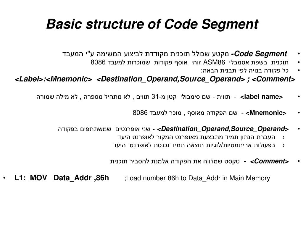 Basic structure of Code Segment • Code Segment- מקטע שכולל תוכנית מקודדת לביצוע המשימה ע"י המעבד • תוכנית בשפת אסמבלי ASM86 זוהי אוסף פקודות שמוכרות למעבד 8086 • כל פקודה בנויה לפי תבנית הבאה: <Label>:<Mnemonic> <Destination_Operand,Source_Operand> ; <Comment> • <label name> - תווית - שם סימבולי קטן מ-31 תווים , לא מתחיל מספרה , לא מילה שמורה • <Mnemonic> - שם הפקודה מאוסף , מוכר למעבד 8086 • <Destination_Operand,Source_Operand> - שני אופרנטים שמשתתפים בפקודה • העברת הנתון תמיד מתבצעת מאופרנט המקורלאופרנט היעד • בפעולות אריתמטיות/לוגיות תוצאה תמיד נכנסת לאופרנט היעד • <Comment> - טקסט שמלווה את הפקודה אלמנת להסביר תוכנית • L1: MOV Data_Addr ,86h;Load number 86h to Data_Addr in Main Memory
