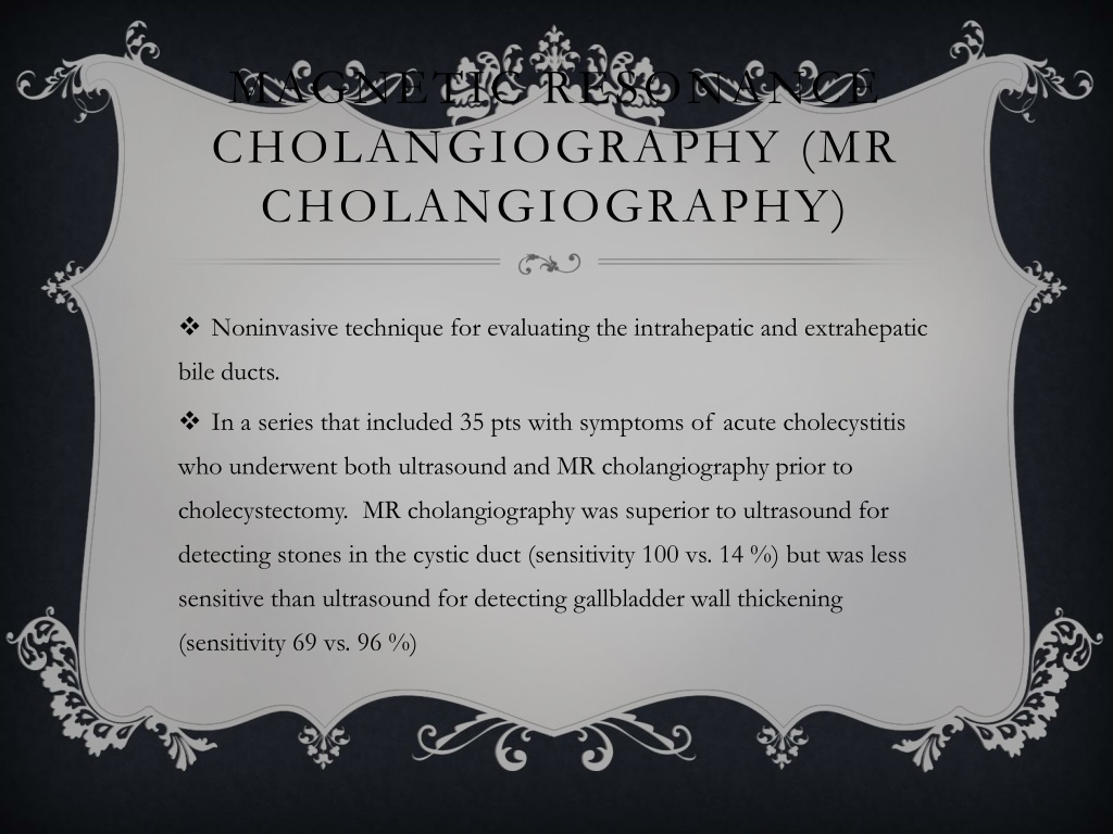 Magnetic Resonance Cholangiography (MR Cholangiography) • Noninvasive technique for evaluating the intrahepatic and extrahepatic bile ducts. • In a series that included 35 pts with symptoms of acute cholecystitis who underwent both ultrasound and MR cholangiography prior to cholecystectomy. MR cholangiography was superior to ultrasound for detecting stones in the cystic duct (sensitivity 100 vs. 14 %) but was less sensitive than ultrasound for detecting gallbladder wall thickening (sensitivity 69 vs. 96 %)