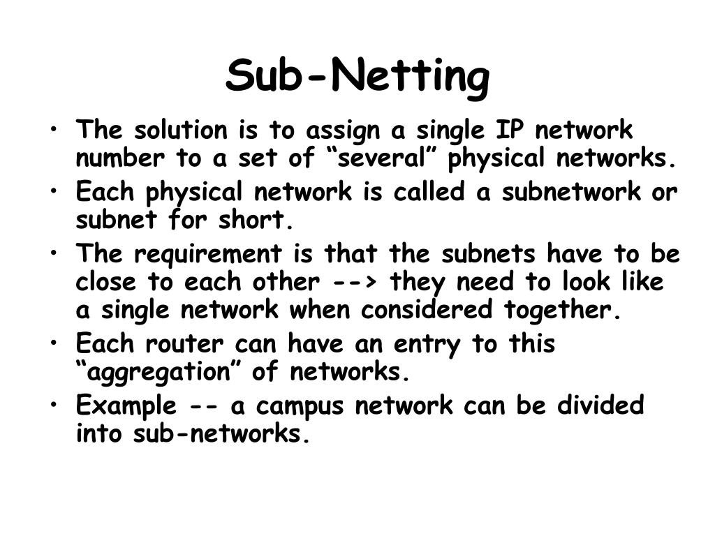 Sub-Netting • The solution is to assign a single IP network number to a set of “several” physical networks. • Each physical network is called a subnetwork or subnet for short. • The requirement is that the subnets have to be close to each other --> they need to look like a single network when considered together. • Each router can have an entry to this “aggregation” of networks. • Example -- a campus network can be divided into sub-networks.