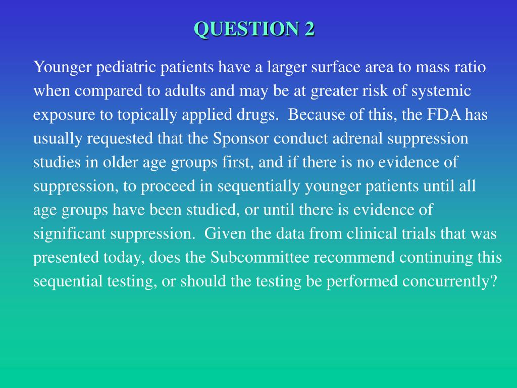QUESTION 2 Younger pediatric patients have a larger surface area to mass ratio when compared to adults and may be at greater risk of systemic exposure to topically applied drugs. Because of this, the FDA has usually requested that the Sponsor conduct adrenal suppression studies in older age groups first, and if there is no evidence of suppression, to proceed in sequentially younger patients until all age groups have been studied, or until there is evidence of significant suppression. Given the data from clinical trials that was presented today, does the Subcommittee recommend continuing this sequential testing, or should the testing be performed concurrently?