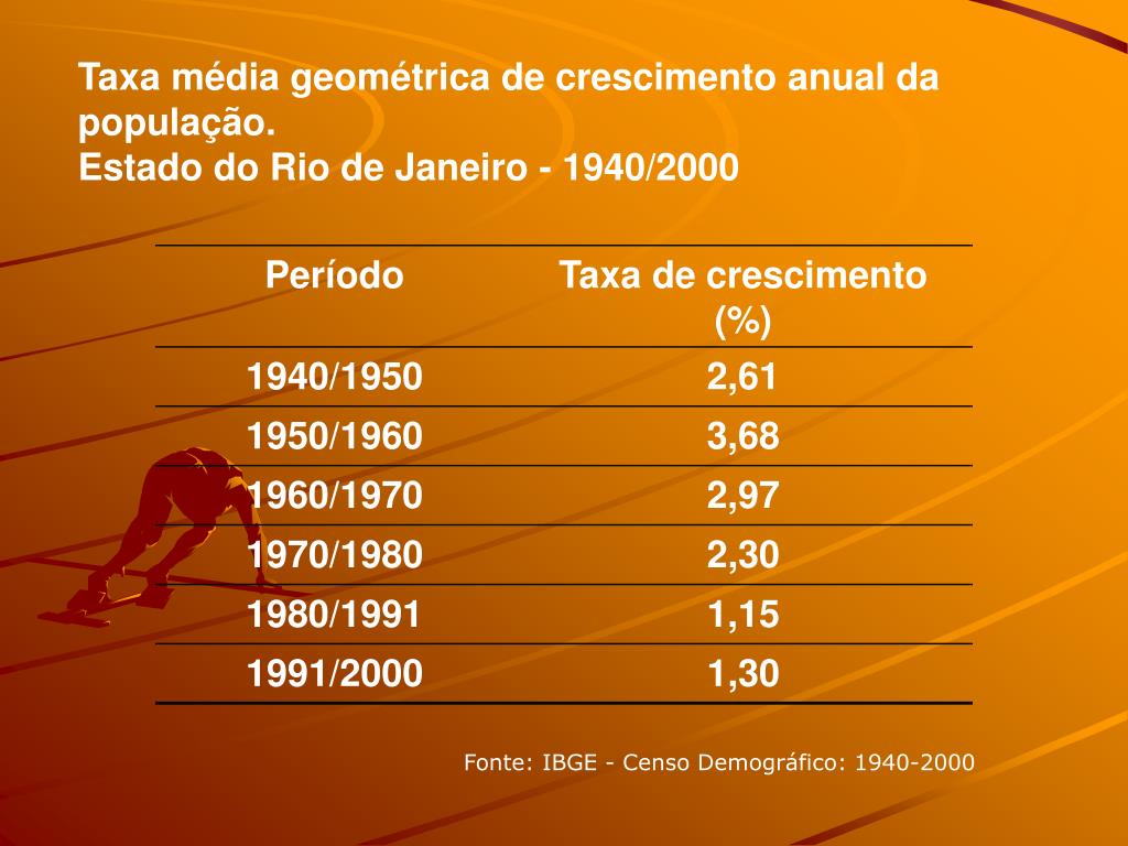 Taxa média geométrica de crescimento anual da população. Estado do Rio de Janeiro - 1940/2000 Fonte: IBGE - Censo Demográfico: 1940-2000