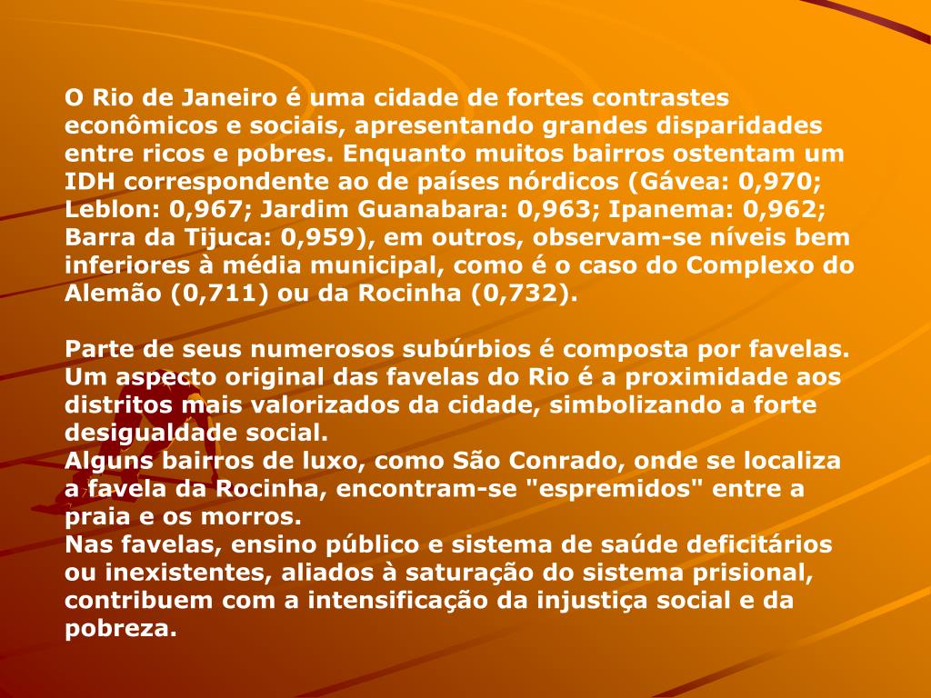 O Rio de Janeiro é uma cidade de fortes contrastes econômicos e sociais, apresentando grandes disparidades entre ricos e pobres. Enquanto muitos bairros ostentam um IDH correspondente ao de países nórdicos (Gávea: 0,970; Leblon: 0,967; Jardim Guanabara: 0,963; Ipanema: 0,962; Barra da Tijuca: 0,959), em outros, observam-se níveis bem inferiores à média municipal, como é o caso do Complexo do Alemão (0,711) ou da Rocinha (0,732). Parte de seus numerosos subúrbios é composta por favelas. Um aspecto original das favelas do Rio é a proximidade aos distritos mais valorizados da cidade, simbolizando a forte desigualdade social. Alguns bairros de luxo, como São Conrado, onde se localiza a favela da Rocinha, encontram-se "espremidos" entre a praia e os morros. Nas favelas, ensino público e sistema de saúde deficitários ou inexistentes, aliados à saturação do sistema prisional, contribuem com a intensificação da injustiça social e da pobreza.