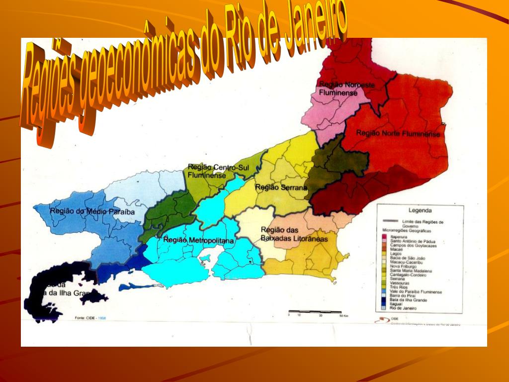 O estado do Rio de Janeiro está dividido em oito Regiões geoeconômicas: I: Região Metropolitana. (Grande Rio). II: Região Noroeste Fluminense. III: Região Norte Fluminense. IV: Região Serrana. V: Região das Baixadas Litorâneas. ( Costa do Sol / Costa Azul / Lagos ). VI: Região do Médio Paraíba. VII: Região Centro Sul Fluminense. VIII: Região da Baía da Ilha Grande. ( Sul fluminense / Costa Verde ).