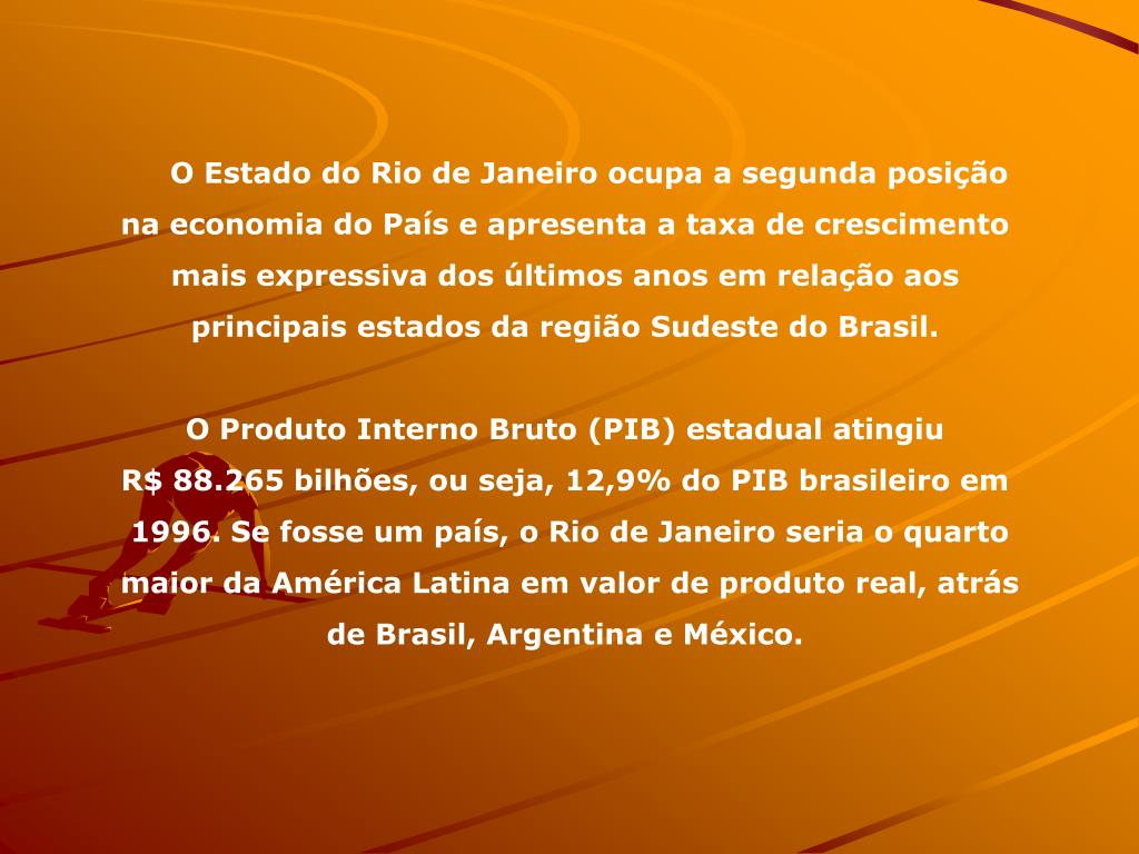 O Estado do Rio de Janeiro ocupa a segunda posição na economia do País e apresenta a taxa de crescimento mais expressiva dos últimos anos em relação aos principais estados da região Sudeste do Brasil. O Produto Interno Bruto (PIB) estadual atingiu R$ 88.265 bilhões, ou seja, 12,9% do PIB brasileiro em 1996. Se fosse um país, o Rio de Janeiro seria o quarto maior da América Latina em valor de produto real, atrás de Brasil, Argentina e México.