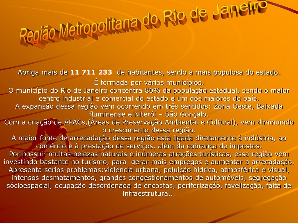 Abriga mais de 11 711 233de habitantes, sendo a mais populosa do estado. É formada por vários municípios.O município do Rio de Janeiro concentra 80% da população estadual, sendo o maior centro industrial e comercial do estado e um dos maiores do país.A expansão dessa região vem ocorrendo em três sentidos: Zona Oeste, Baixada fluminense e Niterói – São Gonçalo.Com a criação de APACs,(Áreas de Preservação Ambiental e Cultural), vem diminuindo o crescimento dessa região.A maior fonte de arrecadação dessa região está ligada diretamente à indústria, ao comércio e à prestação de serviços, além da cobrança de impostos.Por possuir muitas belezas naturais e inúmeras atrações turísticas, essa região vem investindo bastante no turismo, para gerar mais empregos e aumentar a arrecadação.Apresenta sérios problemas:violência urbana, poluição hídrica, atmosférica e visual, intensos desmatamentos, grandes congestionamentos de automóveis, segregação sócioespacial, ocupação desordenada de encostas, periferização, favelização, falta de infraestrutura... Região Metropolitana do Rio de Janeiro